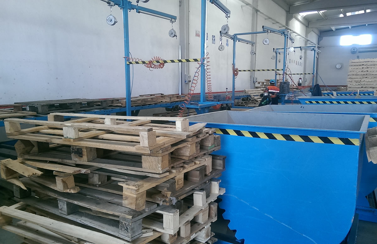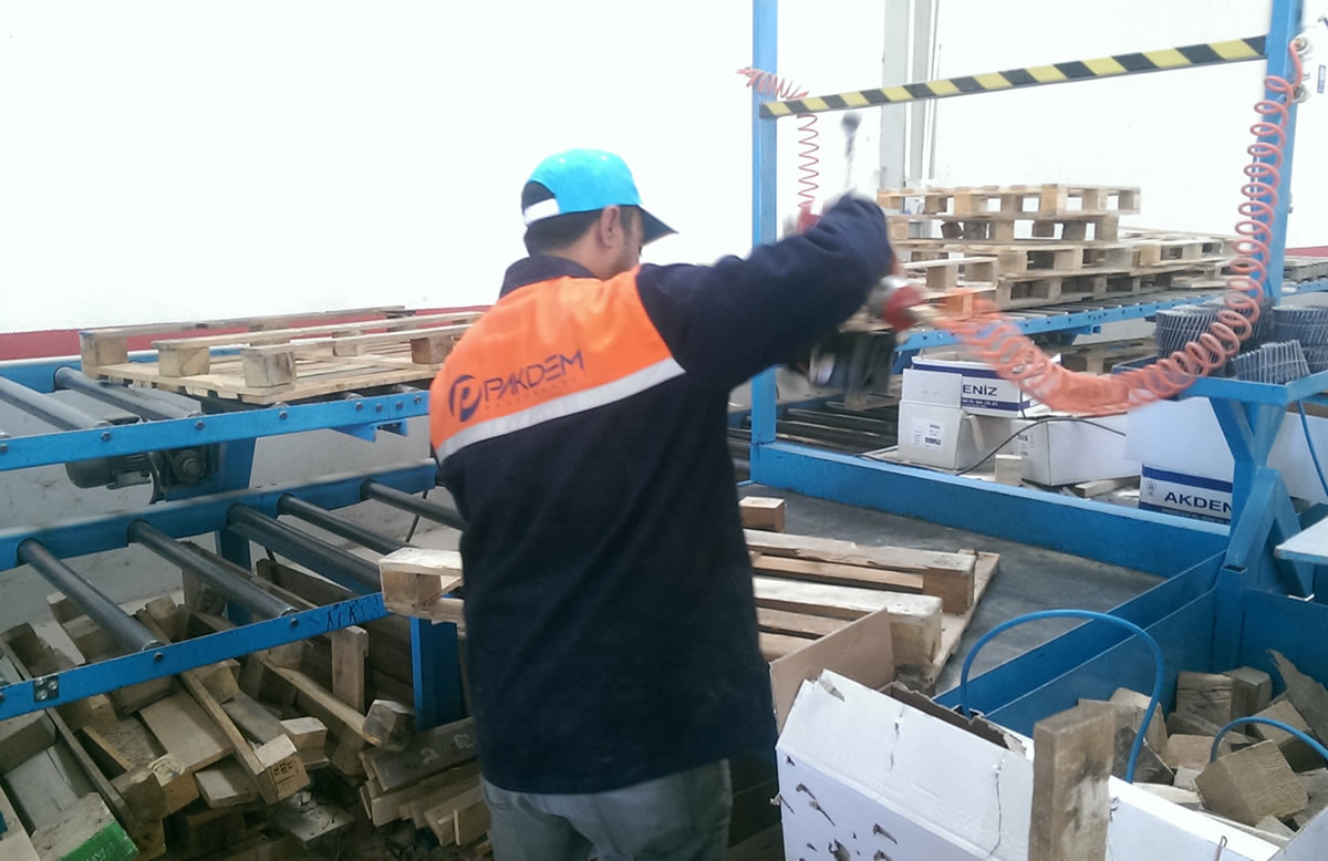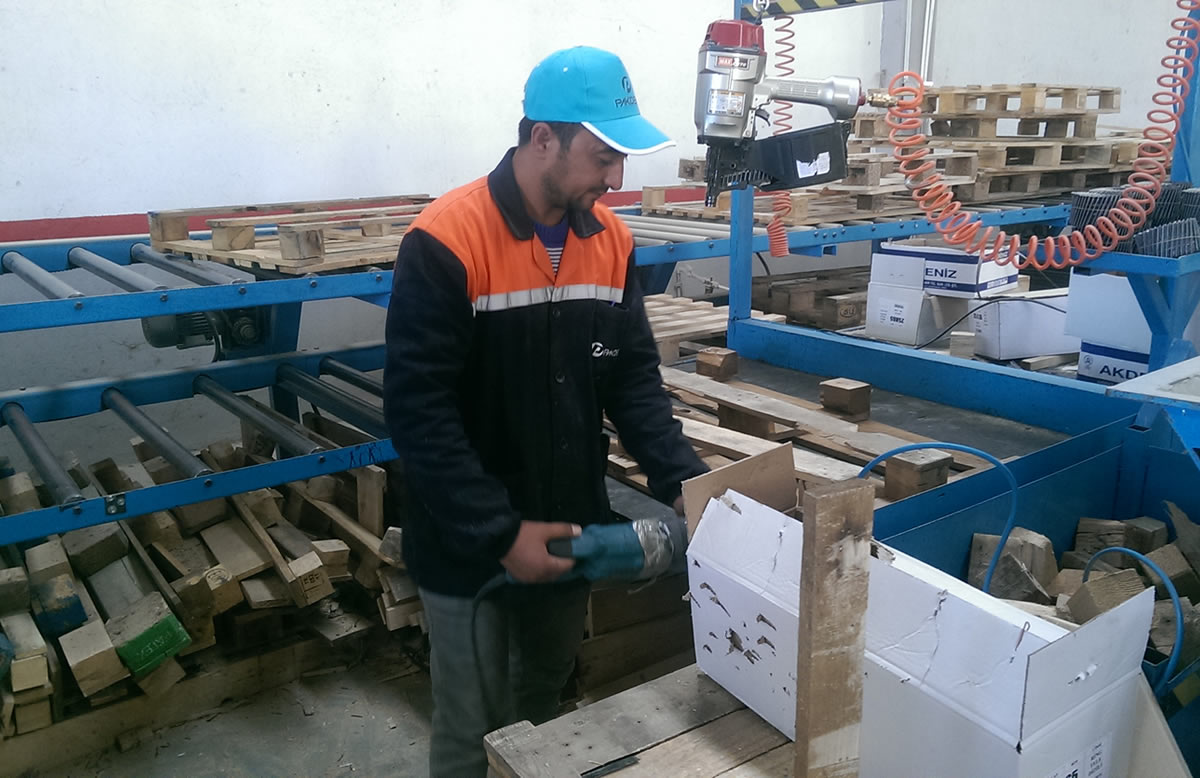 İkinci el olarak gelen bozuk hurda palet imalatı için yapılmış palet revizyon hattıdır. 1- 8 kişilik çalışma ekibi göre ayarlanmıştır. Her çalışan kişiye 1 motor ve sensör ayarlanmıştır. 2- Çalışanın her aldığı palet sonrasında hemen önüne tekrar palet gelecek şekilde otomasyon sistemi uygulanmıştır. 3- Palet revizyonu bittikden sonra alt banta verilerek paletin toplanma yerine aktarımı kolayca sağlanmaktadır. 4- Bantımız özel çift sıra dişliler ile çalışmaktadır. Rulolarda dönmeme olayı yaşanması mümkün değildir. 2.2 kW motorlar ile bantımızda palet aktarımı kolay bir şekilde sağlanmıştır. 5- Hattımızın yanındaki masalar ile palet revizyon edilir. 2 adet çivi çakım tabancası konularak ve yukarıya yay sitemi ile asılarak operatörlerin tabancayı taşımadan palet çivi çakımları sağlanmış olunur. Tabanca yay sistemi ile bağlanıp işi bittikten sonra kendi kendine yukarı çıkar ve palet revizyonuna engel olmadan yukarıda asılı kalır. 6- Masaların alt ve kenar kısımlarına paletin boylarına göre tahta koyma yerleri konulmuştur. Ve operatörün önceden koyduğu tahtaları revizyon işlemi sırasında kolaylıkla ulaşarak hızlı bir şekilde revizyon işlemine devam eder. 7- Bu sistem ile operatörden alınan verim neredeyse %100 artmaktadır. Hem zaman kaybı önlenmektedir hem operatörün taşıyacağı ağır yükler üzerinden alındığı için operatör daha verimli çalışacaktır. Toplam revizyon edilen palet miktarında ise ciddi oranlarda artış sağlanmaktadır.