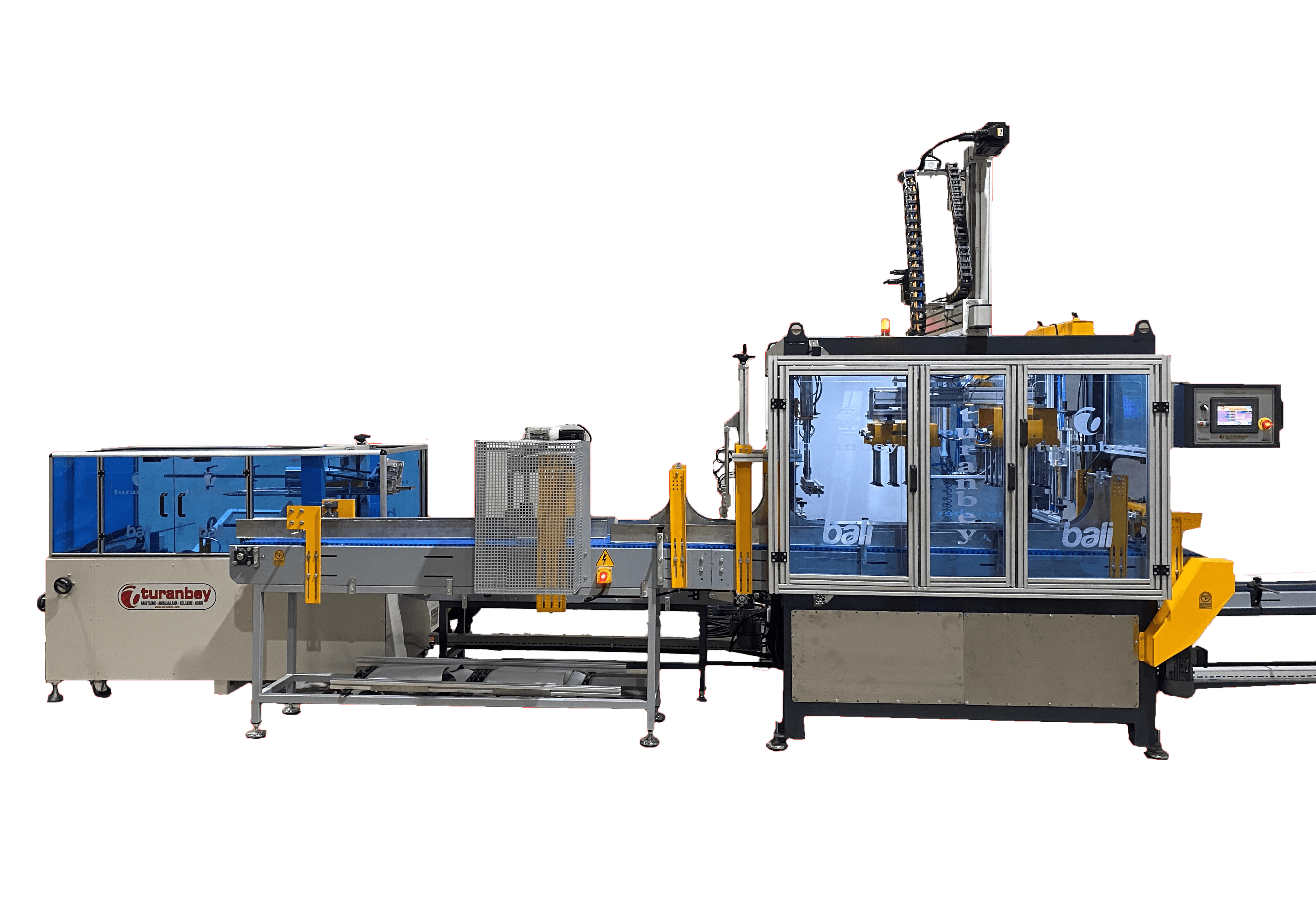 Üretim dolum hattından gelen ürünler Tam Otomatik Koli Dolum Robotuna gelir ve istenilen miktarda gruplanır. Tam Otomatik Karton Hazırlama Makinesinden gelen kolilere, vakum vantuzlu veya gripper (tutma-sıkıştırma)